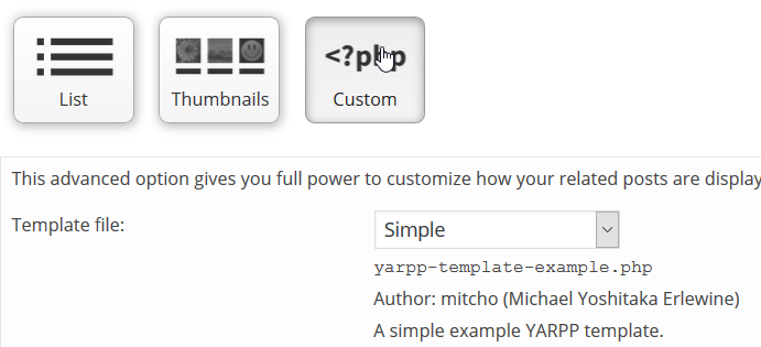 Click on “Copy Templates” button. This will cause the built-in custom templates in the YARPP plugin to be copied to your current theme folder. After that, the Custom button under Display Option should be enabled. Clicking on it will give you an option with a list of built-in templates to choose from: